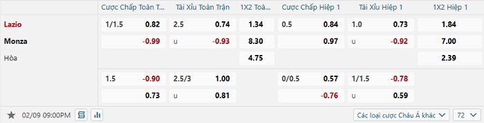 Tip kèo Châu Á hiệp 1 Lazio vs Monza