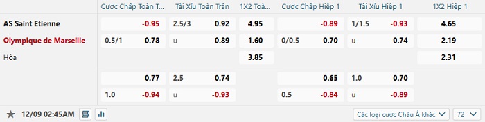 Tip kèo Châu Á hiệp 1 Saint Etienne vs Marseille