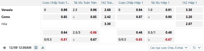 Tip kèo Châu Á hiệp 1 Venezia vs Como