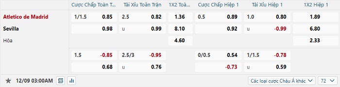 Tip kèo Châu Á hiệp 1 Atletico Madrid vs Sevilla