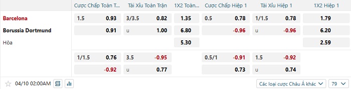 Tip kèo Châu Á full trận Barcelona vs Dortmund