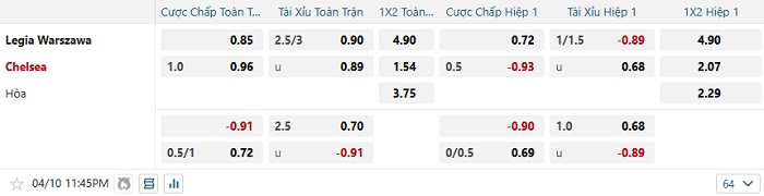 Tip kèo Châu Á hiệp 1 Legia vs Chelsea