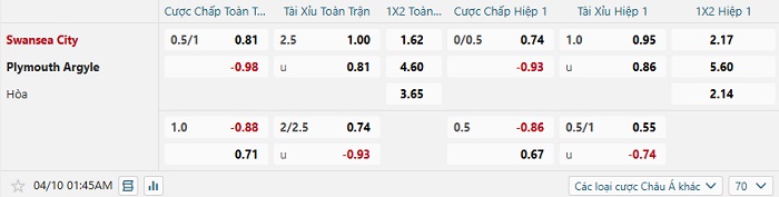 Tip kèo Châu Á hiệp 1 Swansea vs Plymouth