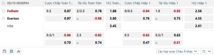Tip kèo Châu Á hiệp 1 Fulham vs Everton