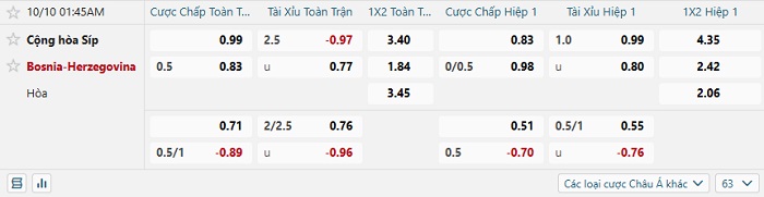 Tip kèo Châu Á hiệp 1 Cộng hòa Síp vs Bosnia