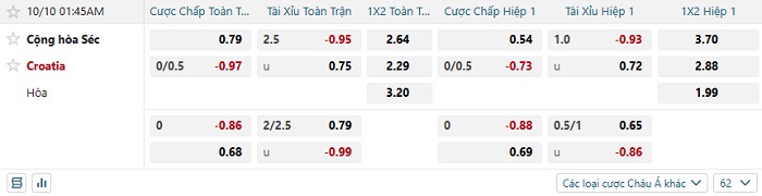 Tip kèo Châu Á hiệp 1 CH Séc vs Croatia