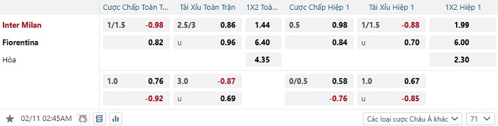 Tip kèo Châu Á full trận Inter Milan vs Fiorentina