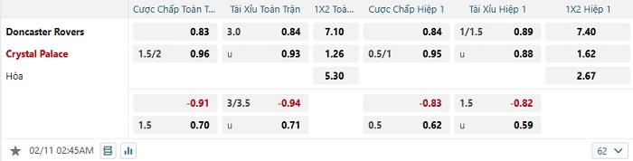 Tip kèo Châu Á full trận Doncaster Rovers vs Crystal Palace