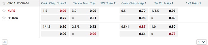 Nhận định trận đấu KuPS vs FF Jaro: Có sức mạnh hoàn toàn áp đảo đối thủ và được thi đấu tại sân nhà, KuPS chắc chắn sẽ có cho mình 1 chiến thắng trong chuyến thi đấu hôm nay. Ở mức chấp châu Á -1 1/2, đội chủ nhà chính là lựa chọn an toàn nhất. Ngoài ra thì lối chơi an toàn của hai đội sẽ khiến cho trận đấu hôm nay có tối đa 2 bàn thắng được ghi.