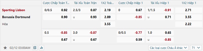 Tip kèo Châu Á hiệp 1 Sporting Lisbon vs Dortmund