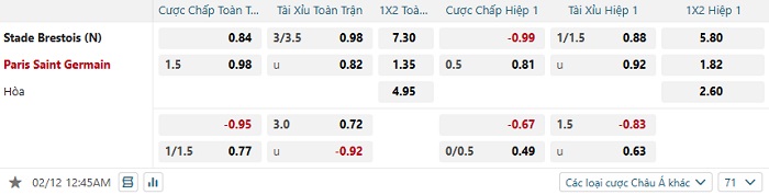Tip kèo Châu Á hiệp 1 Brest vs PSG