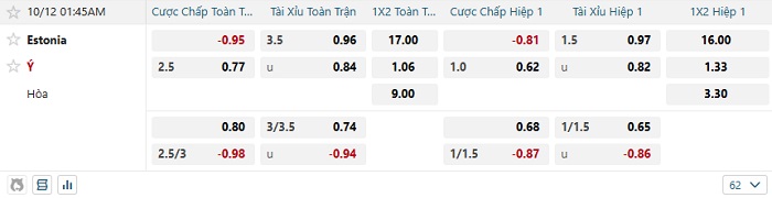 Tip kèo Châu Á hiệp 1 Estonia vs Ý