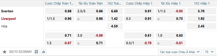 Tip kèo Châu Á full trận Everton vs Liverpool