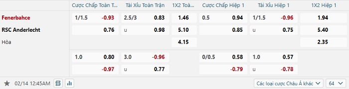 Tip kèo Châu Á full trận Fenerbahce vs Anderlecht