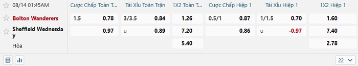 Tip kèo Châu Á hiệp 1 Bolton Wanderers vs Sheffield Wednesday