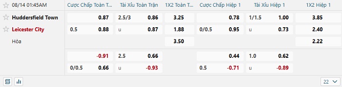 Tip kèo Châu Á hiệp 1 Huddersfield vs Leicester