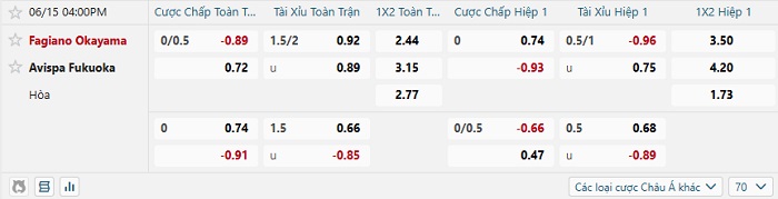 Tip kèo Châu Á hiệp 1 Fagiano Okayama vs Avispa Fukuoka
