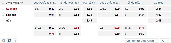 Tip kèo Châu Á full trận Milan vs Bologna