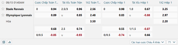 Tip kèo Châu Á hiệp 1 Rennes vs Lyon