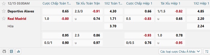 Tip kèo Châu Á hiệp 1 Alaves vs Real Madrid
