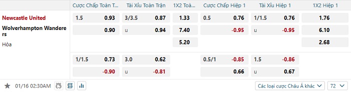 Tip kèo Châu Á full trận Newcastle vs Wolves