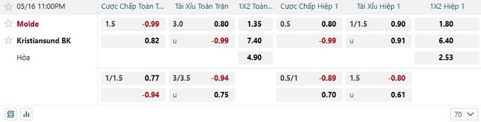 Tip kèo Châu Á hiệp 1 Molde vs Kristiansund