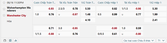 Tip kèo Châu Á hiệp 1 Wolves vs Manchester City