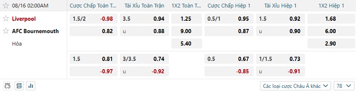 Tip kèo Châu Á full trận Liverpool vs Bournemouth