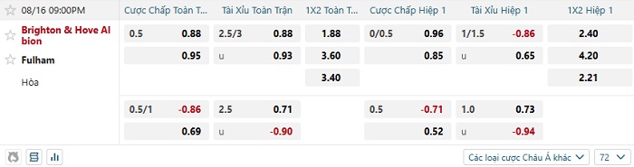 Tip kèo Châu Á full trận Brighton vs Fulham