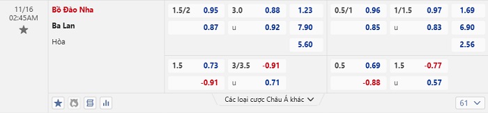 Tip kèo Châu Á hiệp 1 Bồ Đào Nha vs Ba Lan