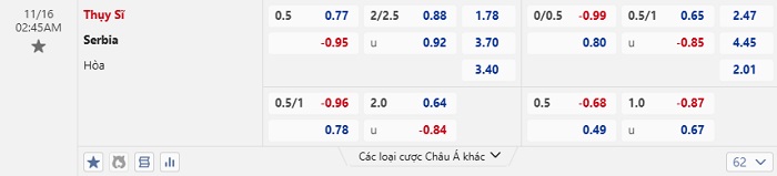 Tip kèo Châu Á full trận Thụy Sĩ vs Serbia
