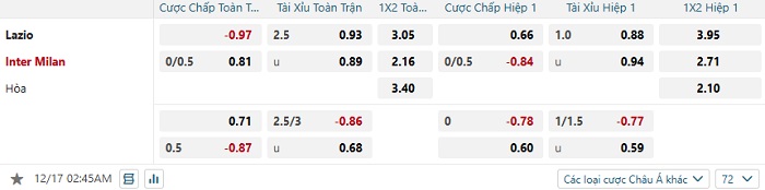 Tip kèo Châu Á full trận Lazio vs Inter Milan