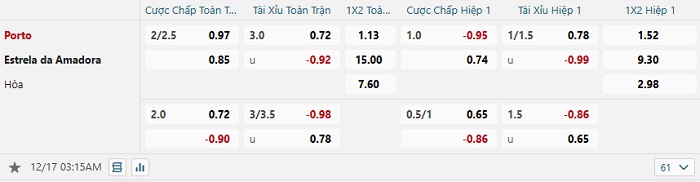 Tip kèo Châu Á hiệp 1 Porto vs Estrela