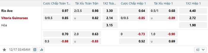 Tip kèo tỷ số Rio Ave vs Vitoria Guimaraes