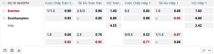 Tip kèo Châu Á hiệp 1 Everton vs Southampton