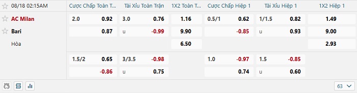 Tip kèo Châu Á full trận Milan vs Bari