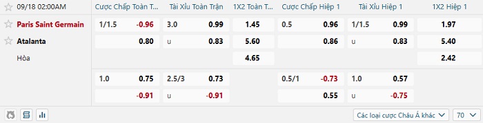 Tip kèo Châu Á full trận PSG vs Atalanta
