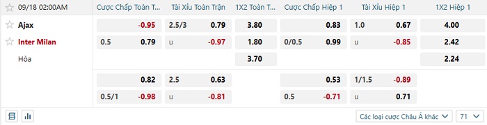Tip kèo Châu Á full trận Ajax vs Inter Milan