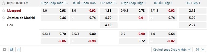 Tip kèo Châu Á full trận Liverpool vs Atletico Madrid