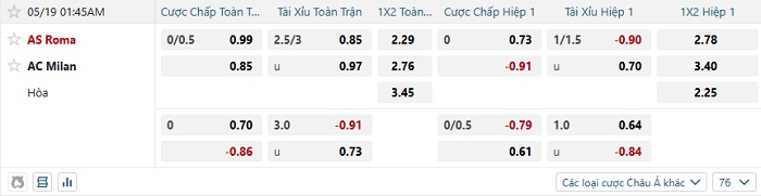 Tip kèo Châu Á hiệp 1 Roma vs Milan