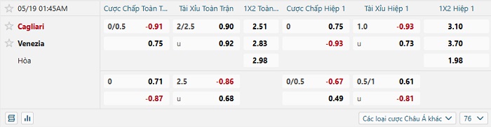 Tip kèo Châu Á full trận Cagliari vs Venezia