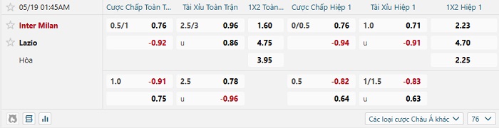 Tip kèo Châu Á hiệp 1 Inter vs Lazio