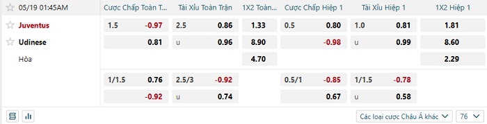 Tip kèo Châu Á hiệp 1 Juventus vs Udinese