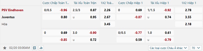 Tip kèo Châu Á full trận PSV vs Juventus