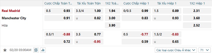 Tip kèo Châu Á hiệp 1 Real Madrid vs Manchester City