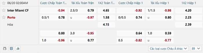 Tip kèo Châu Á full trận Inter Miami vs Porto