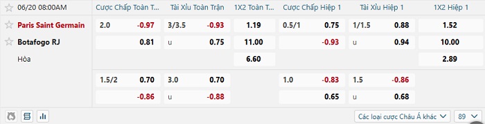 Tip kèo Châu Á full trận PSG vs Botafogo