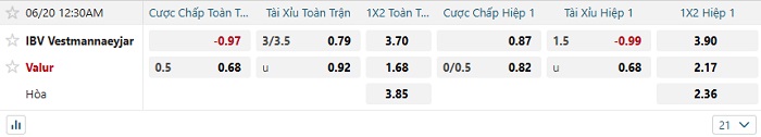 Tip kèo tỷ số IBV Vestmannaeyjar vs Valur