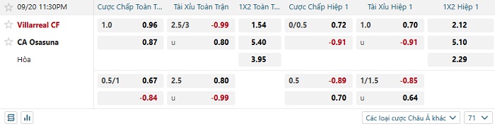 Tip kèo Châu Á hiệp 1 Villarreal vs Osasuna