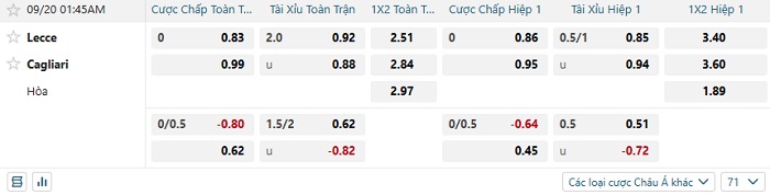 Tip kèo Châu Á hiệp 1 Lecce vs Cagliari